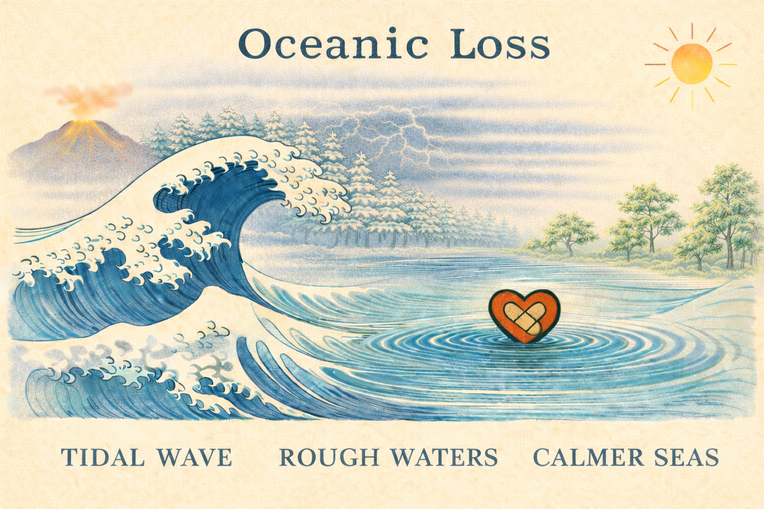 The Liquid Phase (The Sea): Most often, estrangement is fluid. Note the ripples in the center where the heart floats.