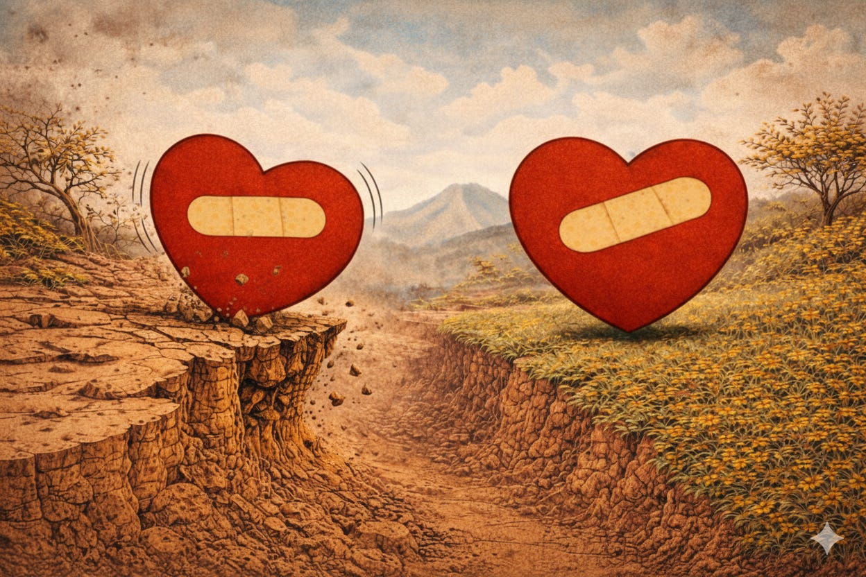 Two Climates, One Horizon: Accepting these different perceptions can feel like you are in separate realities. In the drawing for this column, the realities are adjacent. Notice that both hearts are bandaged; they are both hurting and carrying the weight of this divide. The heart depicting your distress is on crumblier ground, but if you can accept these separate realities, you can look up to see you are looking at the same horizon—you have more in common than you realize.